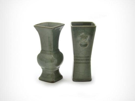 花觚撇口,长方颈,鼓腹,高胫,近底处外撇,通体施青釉此瓶釉面肥厚润泽,闪现一种酥油般光泽,具有独特的艺术魅力。在造型上也颇具特色,器身于稳重端庄中以凹凸变化的弦纹线条突出其精巧。