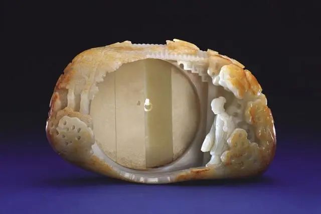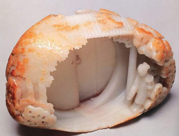 原来,这件玉山子雕刻的原料本是羊脂白玉碗的边角料,带着黄色玉皮,并且还有取出中心雪白部分制作玉碗时留下的裂缝。