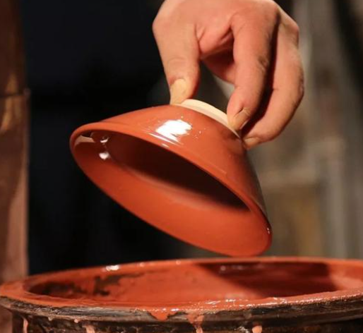 其二,建盏胎骨中含铁量较高,人称“铁胎”。其截面呈色较黑,厚实坚硬,扣之有金属声。