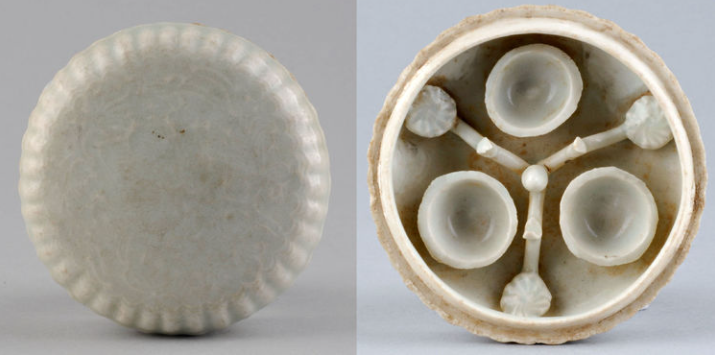 打开盒盖后更是别有洞天,有的粉盒内会堆塑出三个小碟,间有枝干和莲花点缀,颇为精巧可爱。