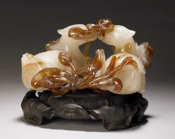 清·俏色玛瑙卧莲鸳鸯 北京故宫博物院藏
