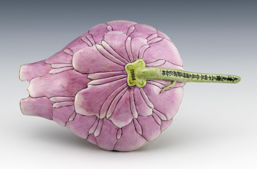 这件粉彩莲花杯是一件吸杯,莲茎部分是中空的管道,作为吸管。又以花瓣为壁、花蕊为底,匠心独运。其着色淡雅,笔画工整细腻,大有工笔意趣。莲茎背面有墨款:“光绪三十四年安徽太湖附近秋操纪念杯”。