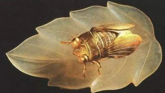 金蝉部分含金量达到九成以上,是工匠采用压模铸范、薄叶延展、錾刻、焊接等工艺打造而成。此蝉形神毕肖,蝉翼轻薄,微微张开,纹路缕缕分明,就好像随时要展翅飞走一般。
