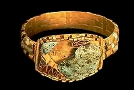 古埃及人很早就把绿松石镶嵌在饰物上。下面这件黄金镶嵌绿松石的臂饰,就是从古埃及王后的木乃伊手臂上发现的。