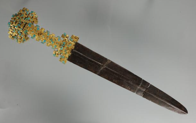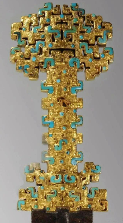 还有下面这把铁剑,其剑柄为金质,上面镶嵌绿松石。这把剑出土于秦地,因其登峰造极的黄金铸造工艺,被称为“秦剑之星”。