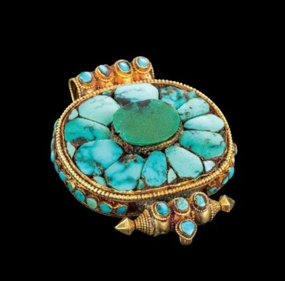 绿松石在我国藏族人心里也有着重要的地位,许多藏人脖子上都佩戴有绿松石,视为灵魂石,传说灵魂石一旦丢进河里,灵魂也将离开躯体。除此以外,藏人的耳饰、头饰、护身符——“嘎乌”(一个小小的佛龛)等等配件,也常常镶嵌绿松石作为装饰,可以说,绿松石被寄托了丰富的宗教信仰色彩。