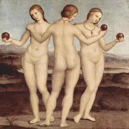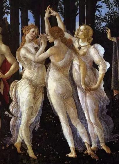 刚开始接触油画的时候,看到这三个光着的女人以奇怪的姿势抱在一起,甚是困惑,后来慢慢了解到,她们原来是希腊神话中的美惠三女神。