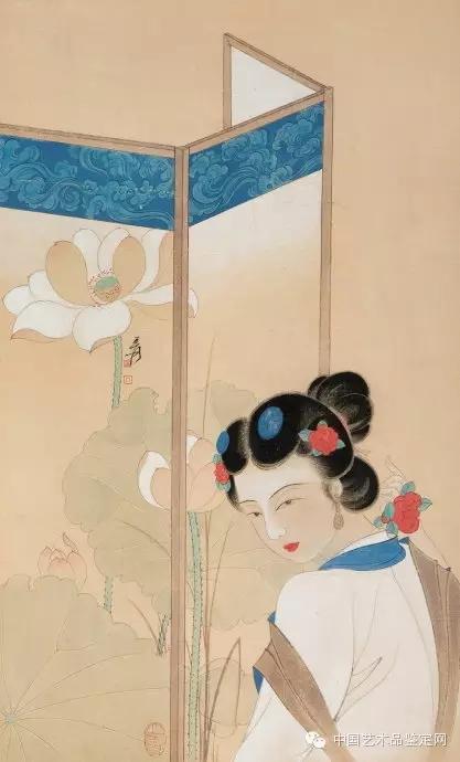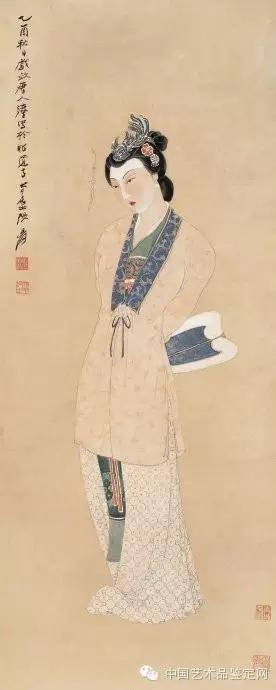 张大千60岁之前的作品,山水高士以传统画法为主,仕女画则以具敦煌壁画意味的为主。山水作品,风貌多变,但大多以干笔皴檫作骨,傅以水墨色彩,或浅绛,或青绿,还有金碧青绿山水。