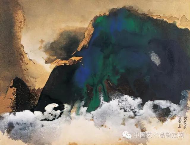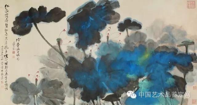 张大千的泼墨、泼彩是文静雍容的,一点没有火爆之气。其作画先以墨色略勾大体位置形状,有时还裱托一层,再泼墨泼彩,七墨、彩显得收放自如,晕淡滋润。作伪者做这类作品则线条勾勒和泼墨泼彩难以做到真正融合和谐,往往显得或两者有脱节感,或线条干涩无法与水墨、色彩融会,或水墨、色彩吞没合理合理的线条,而且,整个画面效果显得紊乱,更勿论画面的深邃灿烂了。
