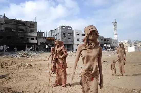 巴勒斯坦艺术家iyad sabbah用泥土创作了一个正在逃离家乡的家庭雕塑,他们身后的家园已经变成一片废墟,这些泥人衣衫褴褛,形态没落,死亡和绝望吞噬着他们原本美好的灵魂,iyad sabbah用这样的雕塑揭示加沙人民悲惨无助的遭遇与苦难。