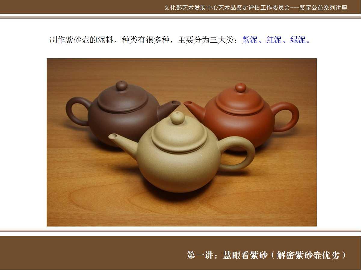 紫砂是一个大概念,紫砂里面有具体的分类,大致分为三大泥系列,紫泥、朱泥也就是红泥、绿泥,细分还有很多,有几十种。