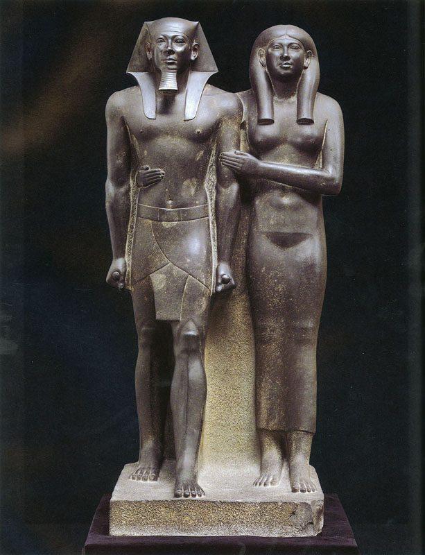 这种雕像形象上力求端庄,威武,逐步制定了一些程式法则。《国王与王妃像》国王夫妇并肩而立,都是左脚略向前迈出半步,但没有行进的动势,全身的重心仍落在两只脚上。在埃及雕刻中从未表现过把全身重心放在一条腿上,而另一条腿轻轻地离开地面的人物,这种站立姿式增强了安定稳固的感觉。国王两臂垂直,双手握拳,以表示力量的集中;王妃左手弯曲放在国王左胳膊上,右手臂搂抱着国王的腰,这是埃及夫妇像的标准格式。雕刻家对男女躯体作了不同的对比处理,通过薄而紧身的长衣刻画出女性柔软起伏的曲线和优美的体形,而国王在埃及雕刻中则是永远年轻而理想化的躯体。