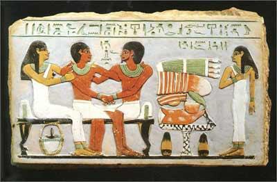 这是古埃及中王国第十一王朝(公元前2000年)时期彩色浮雕作品。彩色浮雕类似于立体绘画,形象微微凸出于壁面,外轮廓仍勾线填色,背景空白处阴刻象形文字以表达画中含意。画中人勾肩搭臂形成一个整体。人物和景物都被置于一个平面,在一条水平线上进行构图安排,极富装饰性,造型程式化富有简练概括单纯的美感。