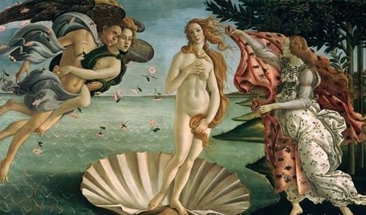 维纳斯从爱琴海中诞生,风神把她吹送到幽静冷落的岸边,而春神芙罗娜用繁星织成的锦衣在岸边迎接她,身后是无垠的碧海蓝天,维纳斯忧郁惆怅地立在象征她诞生之源的贝壳上,体态显得娇弱无力,对迎接她的时辰女神和这个世界毫无激情,不屑一顾。这个形象告诉观赏者,女神是怀着惆怅来到这充满苦难的人间的。