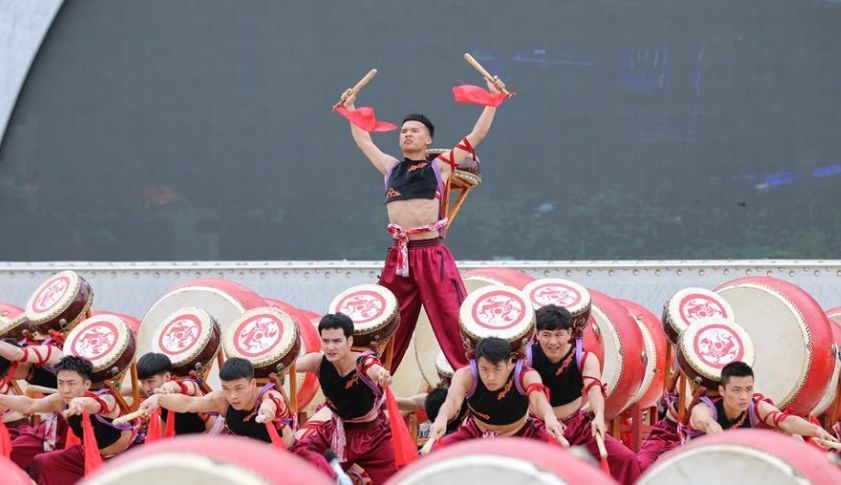 6月18日,演员在吉首鼓文化节开幕式上表演。当日,2019吉首鼓文化节在湖南省湘西土家族苗族自治州经济开发区文化广场开幕,来自海内外的多支鼓队参与活动,展示了不同地域的鼓文化。系列活动将持续到6月21日。