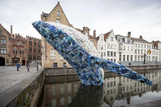 在今年主题为“流动的城市”的比利时布鲁日艺术与建筑三年展Bruges Triennial 上,美国STUDIOKCA事务所从太平洋撤出了5吨塑料废物,用这些海洋垃圾变成了一个 4 层楼高的鲸鱼雕塑,作品名为“摩天大楼(布鲁日鲸鱼)”,以跃姿鲸鱼的被安置在比利时城市的主要运河中供游客参观,这一令人印象深刻的装置作品旨在让人们关注海洋中数量巨大的塑料废弃物等海洋垃圾坏境问题。
