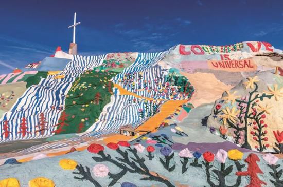 在加利福尼亚沙漠的深处,约书亚树国家公园以南,一座色彩斑斓的小山在荒漠中拔地而起。这不是地壳运动的结果,而是一个男人花了30年造出的杰作。这一远远看上去像是游乐场的小山,被人们亲切地称为“救世山”(Salvation Mountain),它就像是沙漠中突然出现在眼前的绿洲,覆盖着颜色鲜艳的花朵和瀑布般的蓝白条纹,还在山坡上写下巨大的文字:“上帝的爱洒满人间。”(Love is universal)来自美国佛蒙特州、自称是“罪人”的莱昂纳德·奈特(Leonard Knight),在2013年的一部纪录片中,他回忆建造“救世山”的契机:“不住地对自己说‘上帝啊,请走进我的心里,饶恕我的罪过’。从此我的人生发生了改变。”从1986年就开始了以艺术救赎灵魂的实践。奈特已于2014年去世,凝聚了他30年心血的“救世山”也得到了当地艺术基金会的妥善保护。