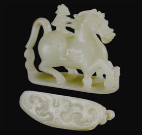 汉代马题材文物中奔马也是一大主题,其中最为人们熟知的当属铜奔马“马踏飞燕”了。无独有偶,汉代玉器也有相类似的奔马,1966年咸阳市周陵乡新庄村出土了一件白玉羽人天马摆件(图2)。玉器通高7、长8.9厘米,由天马、羽人、踏板三部分组成。天马昂首张口,双耳竖立,马尾高扬,右前蹄悬空抬起,腹部两侧雕有双翼,蹄下长方形踏板上线刻着涌动的祥云,天马如驰骋于云间。马背上的羽人高鼻长脸,双耳过项,肩臂部生翼,左手握缰绳,右手持灵芝草。这件玉摆件出土于汉元帝渭陵的“长寿园”建筑遗址范围内,其相对年代比较明确,应是当时宫中陈设珍品之一。