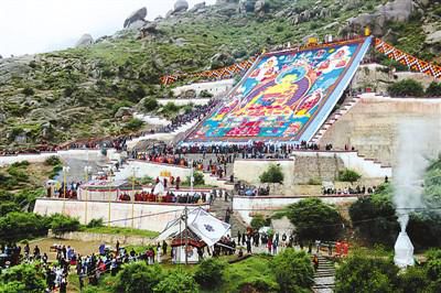 图为日前,西藏拉萨哲蚌寺举行盛大展佛仪式,一年一度的雪顿节正式拉开帷幕