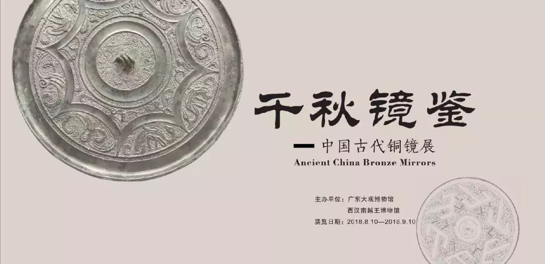 “千秋镜鉴--中国古代铜镜展”于2018年8月10日至2018年9月10日在西汉南越王博物馆举行。此次展览共展出广东大观博物馆藏铜镜136枚、拓片23件,年代跨越战国至唐代。通过多种纹饰和造型的铜镜,展览将引导观众鉴赏铜镜千余年间“美的历程”,探索中国古代铜镜文化及其内涵。