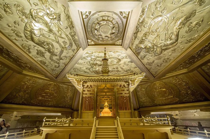 2018年12月7日,山西太原太山龙泉寺舍利塔复建工程正在进行,其中用65吨纯铜打造的仿唐地宫基本完工,金碧辉煌的内饰在灯光的照射下熠熠生辉。太山龙泉寺唐代舍利塔遗址发现于2008年5月7日,大约修建于武周至唐景云年间,保存完整,是中国以佛塔地宫瘗埋舍利的早期实例,也是佛教传入中国后与当地文化相融合的实物见证。