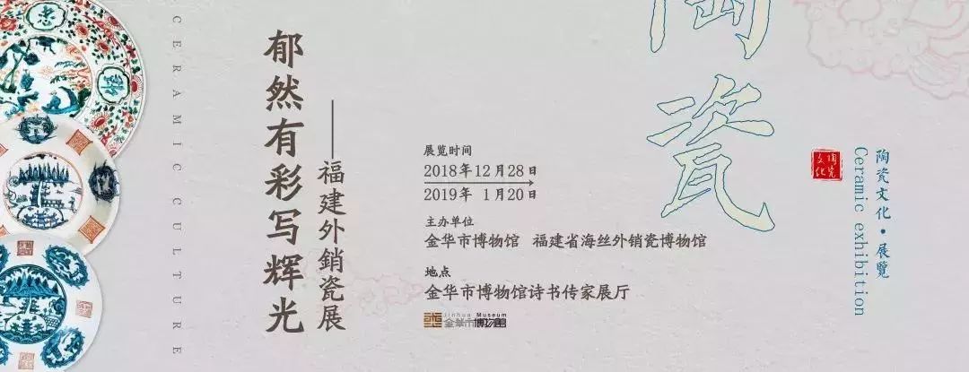 “郁然有彩写辉光--福建外销瓷展”于2018年12月28日至2019年01月20日在金华市博物馆诗书传家展厅举行。本次展览精选240件文物,涵盖闽地各代表性窑口,让人们感知历史的辉煌,弘扬陶瓷文化的精华,为当前实施“一带一路”的伟大战略构想提供正能量。