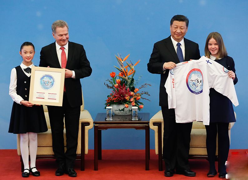 1月14日,中国国家主席习近平同芬兰总统尼尼斯托在北京共同出席“2019中芬冬季运动年”启动仪式。中芬两国少年儿童分别向两国元首赠送中芬冬季运动年标识和纪念品。