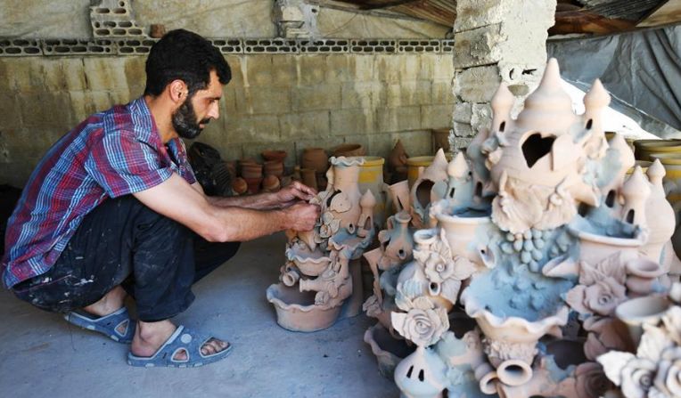 近日在叙利亚霍姆斯,扎卡莱亚·卡尔库什在作坊内工作。扎卡莱亚·卡尔库什是一名陶器手艺人,叙利亚内战爆发前,他和家人生活在阿勒颇。后来,为躲避战火,他和家人不得不离开家乡,流落到霍姆斯。