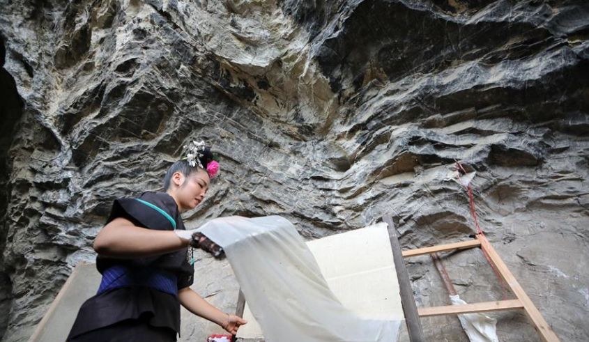 7月1日,在贵州省丹寨县南皋乡石桥村,苗族妇女在烘干手工皮纸。贵州省丹寨县石桥村是首批国家级非物质文化遗产“皮纸制作技艺”的传承地之一。近年来,造纸技艺传承人弘扬传统工艺,将古法造纸加以文创设计,产品畅销国内外市场,民族传统工艺也成为旅游观光的新热点。