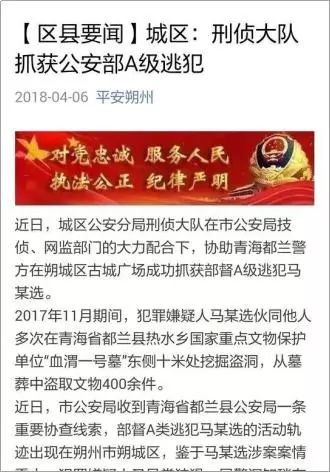 日前,山西省朔州市公安局通过官方微信 “平安朔州”发布消息,被公安部列为A级逃犯的涉嫌偷盗青海省都兰县“血渭一号大墓”的嫌疑人马某选被朔州警方抓获。此人伙同他人,从国家重点文物保护单位“血渭一号大墓”东侧十米处挖掘盗洞,盗取文物400余件。
