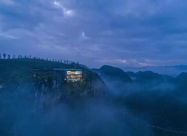 夜幕降临,马尾峡谷安静下来。群山留住白天太阳的余温,在峡谷里升腾出一股雾气。峡谷北面的一面崖壁,云雾缭绕。天色迅速暗下来。就在峡谷即将进入完全黑暗的时候,崖壁顶端亮起一团黄色的光,透过云雾,若隐若现。这团光来自贵州安龙溶岩美术馆。美术馆建在165米高的悬崖上,被誉为“中国第一座悬崖峭壁上的美术馆”。美术馆于2017年10月建成,目前还未正式开放。
