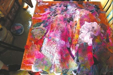打捞清理出来的皮影,经洪水浸泡后皮质被颜料污染,几近报废