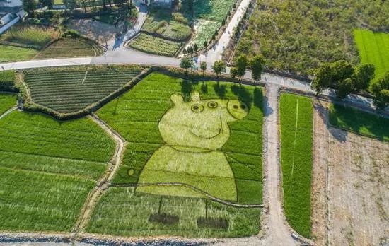 2018年7月20日,安徽歙县溪头镇蓝田村的农民在水稻田里搞起了新花样,不同色彩的水稻“秀”出了各种美丽的图案。从空中俯瞰,用不同颜色水稻种植出来“小猪佩奇”、“凯蒂猫”等造型别致的创意水稻图案在一望无垠的农田上清晰可见。据了解,这片创意稻田的图案经过农业技术人员精心构思及设计,种植前,先根据田块的尺寸设计图案,然后参照“十字绣”的方法在田块进行定格拉线,最后,由当地经验丰富的农户在图案轮廓内种植不同颜色的秧苗,轮廓外种植绿色秧苗作为背景色。