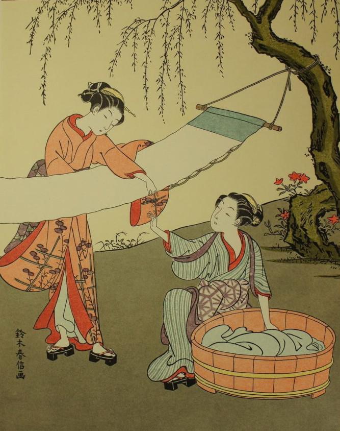 铃木春信,日本江户时代浮世绘画家。本名穗积次郎兵卫,号长荣轩。致力于锦绘(即彩色版画)创作,以描绘茶室女侍、售货女郎和艺妓为多。受中国明末清初“拱花”印法的影响,在拓印时往往压出一种浮雕式的印痕,自成风格,称为“春信式”。