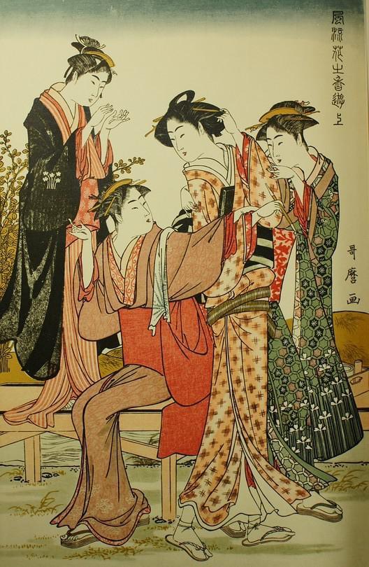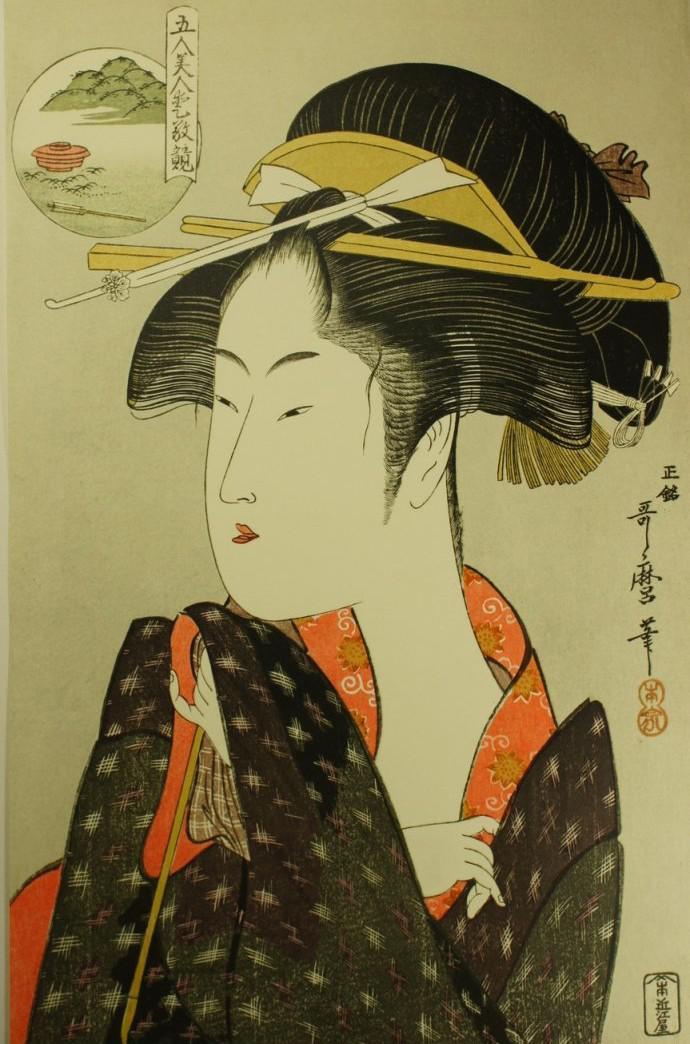 作为浮世绘美人画家,喜多川歌麿直追鸟居清长。他与当时的文学名人结交,以新的时代感觉,在绘画中追求合乎理想和社会风尚的美,的画以准确的线条和单纯的色块著称,善于刻画人物心理活动。其画风一直影响到近现代,追随者甚众。