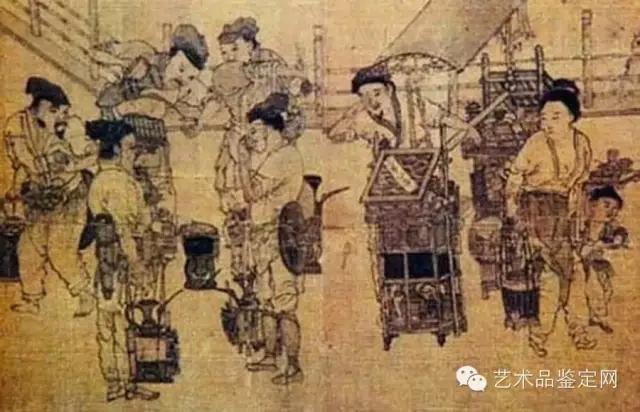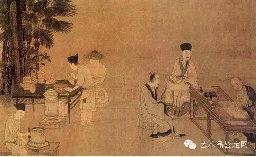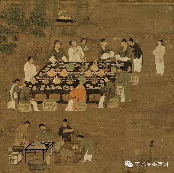 《文会图》是公认的描绘茶宴的佳作,展现出宋代文人雅集的典型场景。从画上可以看到环桌而坐的文士,正进行着茶会。僮仆使用及准备中的茶具,在存世北宋茶器中有相应的例子,画家所绘确有根据。