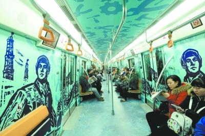 4.12月1日,辽宁省“沈阳历史”主题地铁列车亮相沈阳地铁2号线。车厢内通过一系列图案、绘画及装饰,让乘客近距离感受沈阳的历史变迁。