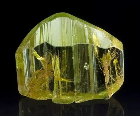 橄榄石晶体多呈斜方柱状体,晶面上有密集的纵纹,大多数情况下为晶体碎块或呈卵石状。 呈玻璃光泽,断口呈玻璃光泽至亚玻璃光泽。