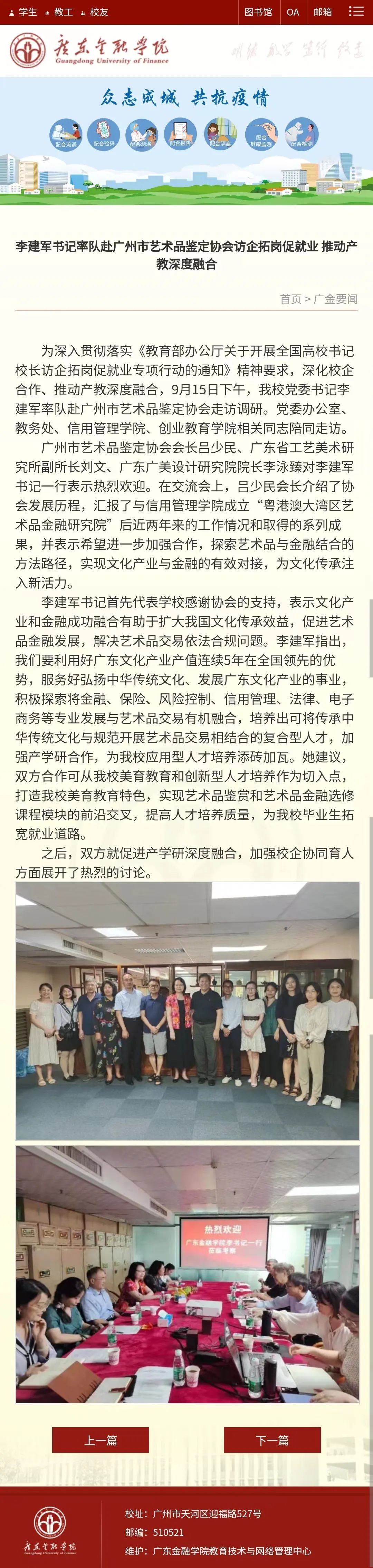 近日,广东金融学院对校党委书记李建军率队赴广州市艺术品鉴定协会走访调研一事高度重视,学校官网及相关院系对此次调研活动发布了重要报道。