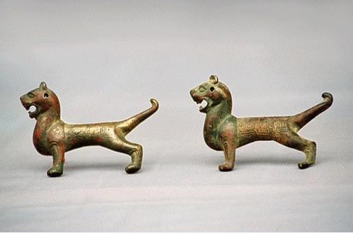 此后,各代沿用虎符为兵符,1955年曾在内蒙古呼和浩特美岱北魏墓出土有北魏时虎符,为完整的两半合成整符,形作伏虎状,前胸左右各刻“河内太守”铭文,腹下分刻“铜虎符左”和“铜虎符右”铭文,背铭“皇帝与河内太守铜虎符第三”一行文字中剖为二,只有合符才能通读。北魏铜符,不仅四肢伏卧,且头部过大,造型远不如先秦虎符英俊生动,刻文亦拙稚,远不如秦杜虎符错金铭文精美。至于虎形铜节,以20世纪80年代初在广东广州象岗山西汉南越王墓出土的虎节最为精美,它被包裹于丝绢内放置在墓内西耳室中部南墙根下。外貌铸成蹲踞的猛虎,张口露齿,弓腰卷尾,虎体主斑系在铸出的弯叶形浅凹槽内贴以金箔片,呈现出斑斓的虎皮形貌,华美生动,器长19厘米。虎节正面有错金铭文,为“王命=车(徒)”五字。从纹饰、文字等方面看,与楚文化似有渊源,值得深入探研。(源自杨泓所著《逝去的风韵》)