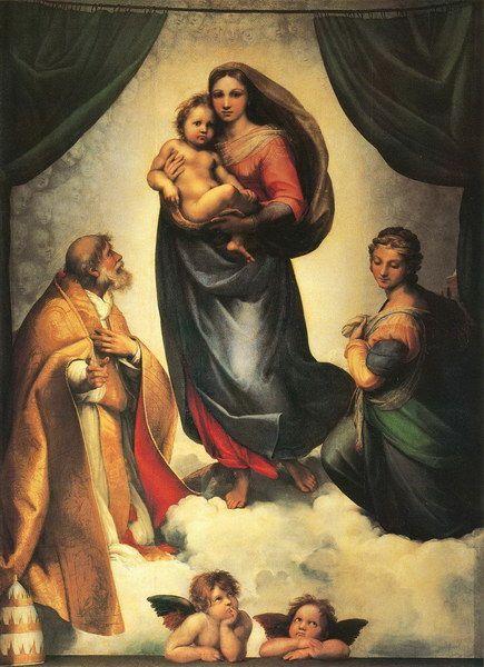 拉斐尔 (1483~1520),以圆润柔和、优雅和谐的画风为其特色。虽然其中多数是宗教和神话题材,但他和许多文艺复兴时期的大师一样,总是力求突破宗教的外壳以表现世俗的现实生活内容。例如他的代表作之一 《西斯庭圣母》中玛丽亚的形象,端庄、朴实,头上没有光圈,身上没有华丽的服饰,完全是人间的年轻母亲的理想形象。拉斐尔另一有代表性的作品是为梵蒂冈宫绘制的 《雅典学派》等四幅巨型壁画,在这些画上体现了作为一个人文主义者对于人类发展进步的观点和向往光明未来的信念。