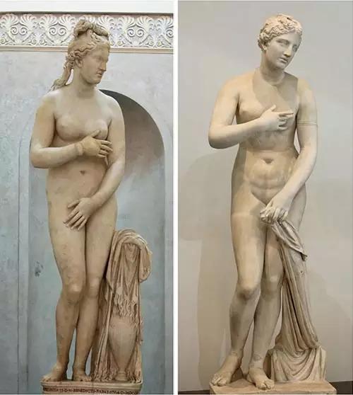 在对后来的裸像产生最大影响的《卡皮托利维纳斯》和《美第奇维纳斯》所塑造的维纳斯形象中,我们也可以看到这种端庄的维纳斯的影子。她们更具紧凑感和稳定感——一手遮胸另一只手遮住私处,微躬着背,显露出一种自我保护意识。