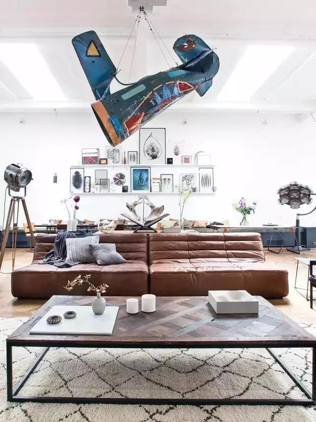 ▲休息区有两个舒适的棕色真皮Togo沙发,天花板悬挂着一架飞机做装饰,而壁炉的设计也有别于一般嵌入式,直接放置在中间,周围堆放着随意切碎的木柴。拱形门廊和大大的窗户能软化的心情,增添了细腻的女人味,整个空间看起来也更宽敞、通风。