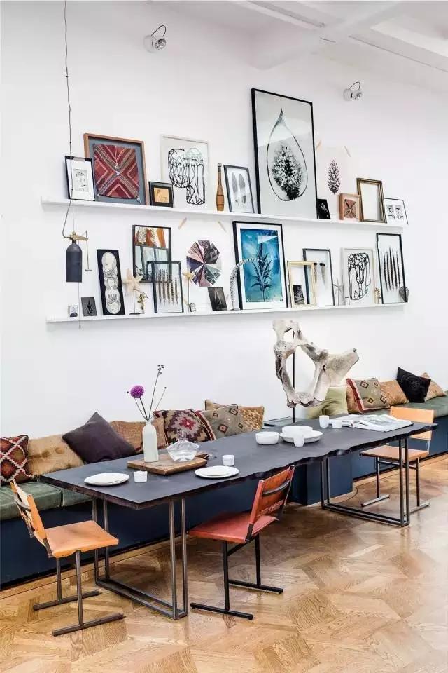 ▲餐桌大气优雅,三脚架落地灯粗犷而壮丽的外观,是典型的工业设计风格元素。书桌边的蓝色长板凳沿墙,而墙上搁架放置的艺术品是屋主的收藏。