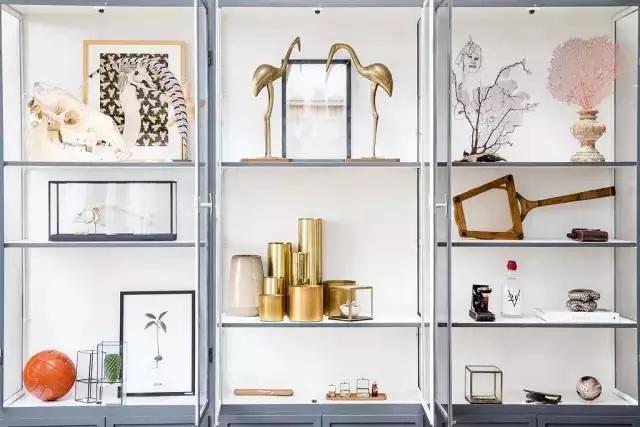 ▲一组金属玻璃柜收藏了各种艺术品,也是房间的装饰,他们的多样性完美地体现了整个屋子的精髓。