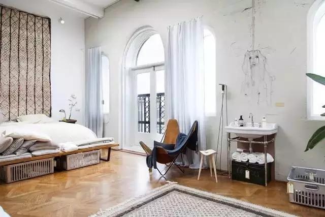 ▲睡觉休息处,床的设计选择半开放式格局,靠近拱形窗户的地方是一个半私人空间,墙面特殊处理,让人感到温暖和舒适。