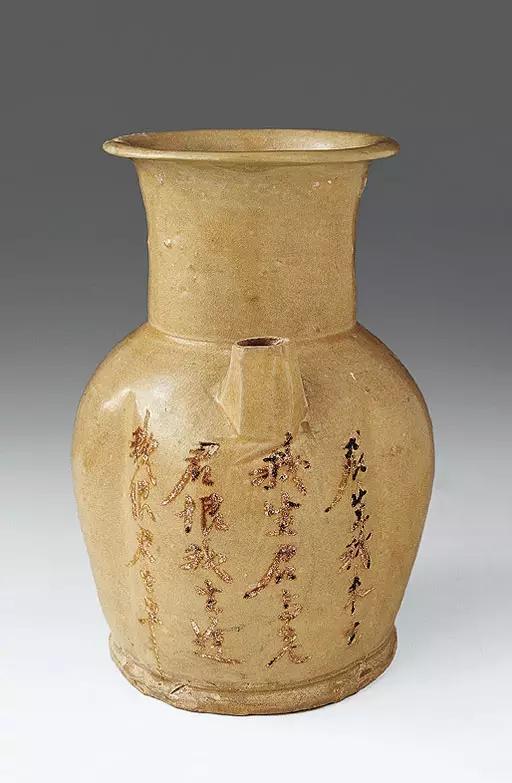 这首五言爱情诗,是描绘男女因相见恨晚而造成不能相守的遗憾,诗意缠绵悲哀,耐人寻味。全诗在壶多棱短流下方以褐彩书,该件瓷壶出土于大唐长沙窑,通过这一批出土壶,我们可以看到诗句饰于壶上醒目部位,注汤斟酒时易映入眼球。我们不要小看只是瓷器上题字,其重要的是反映出釉下彩绘这种中国瓷器装饰技术的重大进步。这些诗句多反映现实生活,故更贴近生活,贴近民间,也更受当时人们喜爱。唐代一部分有字器物无意间就成了唐代重要阶段或事件的见证。