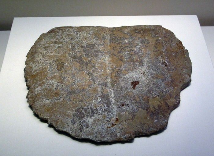 器物示例:石耜,长23.3厘米,宽23.5厘米。新石器时期,把石耜作为掘土和翻地农具。它比铲体形大,扁平锋利,多为长方形,也有舌形、桃形、梯形和椭圆形,两面刃。商朝,石耜仍在农业上占有重要位置。