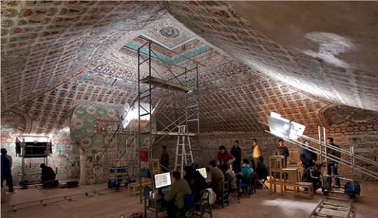 图为敦煌莫高窟第61窟壁画数字化作业现场