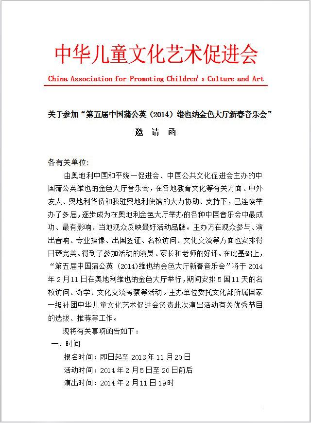 下一篇: 关于参加“第五届中国蒲公英(2014)维也纳金色大厅新春音乐会” - 2013.09.29